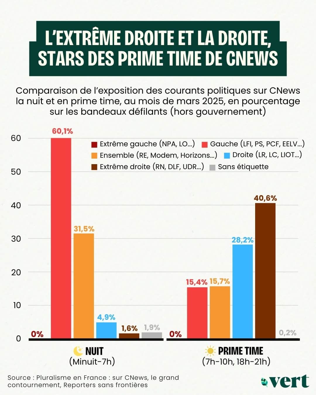 L’heure des faux. Chaîne d’information en continu appartenant à la galaxie Bolloré, CNews est tenue par une convention avec l’Arcom, le régulateur de l’audiovisuel, de garantir la pluralité politique. Un principe dont elle chercherait pourtant à s’affranchir, a révélé une enquête de Reporters sans frontières (RSF) mercredi. L’organisation de défense des droits de la presse a passé au crible les antennes des quatre chaînes françaises d'information en continu (BFMTV, CNews, France info, LCI) du 1er au 31 mars 2025, à l'aide d'un outil automatique de capture d'écran qui a permis d'analyser 700 000 bandeaux. Verdict : «CNews, loin de respecter le pluralisme à l'antenne comme elle s'en targue, triche», affirme RSF. Comment ? L’organisation a remarqué que la chaîne mettait en avant des invité·es de gauche principalement la nuit, lorsque l’audience est faible, et réservait les heures de grande écoute à des personnalités classées à l’extrême droite.