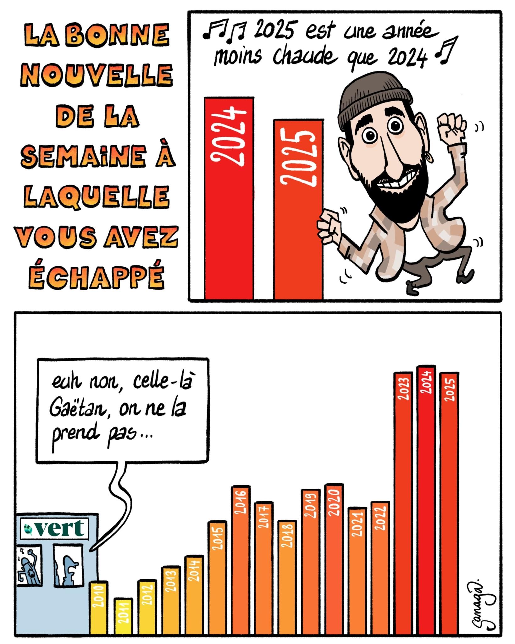 · Mercredi, l'observatoire européen Copernicus a dévoilé son rapport définitif sur l'état du climat en 2025. L'an passé, la température moyenne mondiale s’est établie à 14,97°C, soit 1,47°C au-dessus des niveaux préindustriels (1850-1900). 2025 se classe ainsi en troisième position des années les plus chaudes jamais enregistrées, à peine 0,01°C derrière 2023, et 0,13°C derrière 2024, l'année record. - Vert