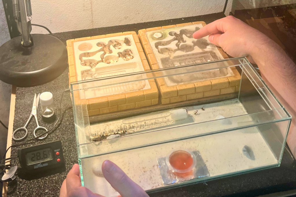 Ces animaux de compagnie peu communs partagent son quotidien depuis deux ans, logés dans une petite fourmilière coulée en plâtre posée sur une étagère. Matthieu leur apporte de quoi vivre : grillons séchés, moucherons et eau gélifiée.