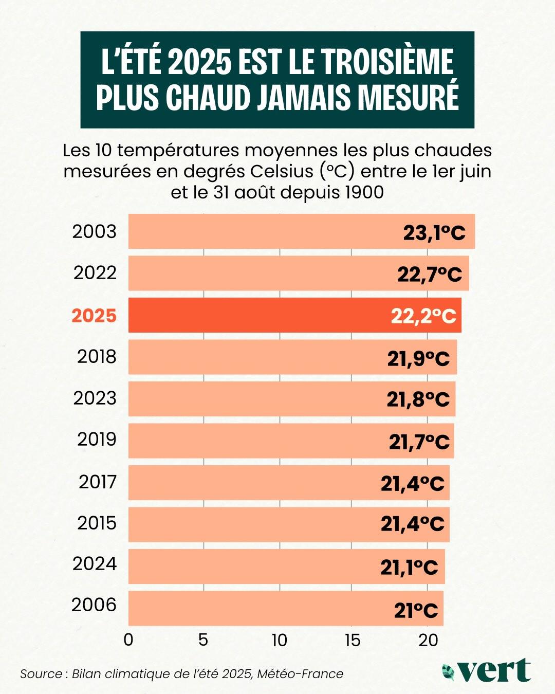 · Mardi, Météo-France a annoncé que la France hexagonale venait de vivre son troisième été le plus chaud depuis le début des relevés en 1900. Avec un mois de juin «extrêmement chaud», suivi de mois de juillet et août plus brûlants que d’habitude, la température moyenne de la saison a atteint 22,2°C. Un niveau qui place l’été 2025 juste derrière les 22,7°C moyens de 2022 et le record de 2003 (23,1°C). - Vert