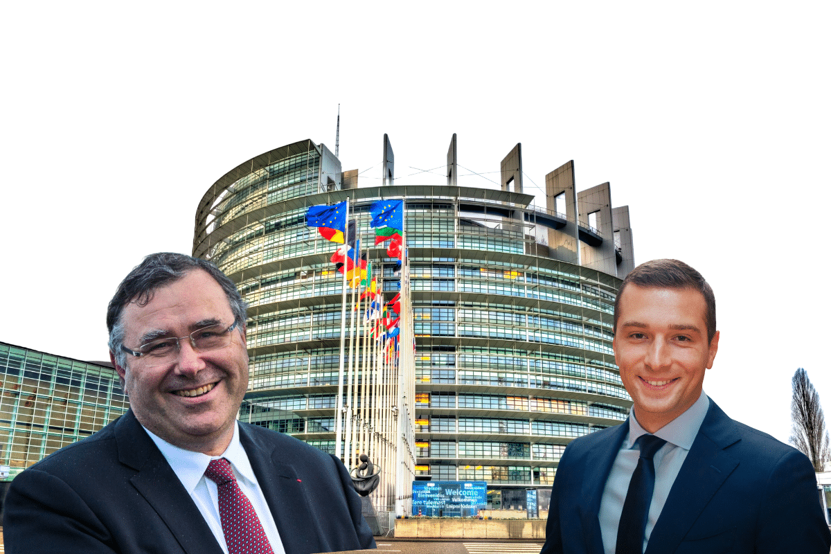 Patrick Pouyanné et Jordan Bardella devant le Parlement européen de Strasbourg. Montage Vert.