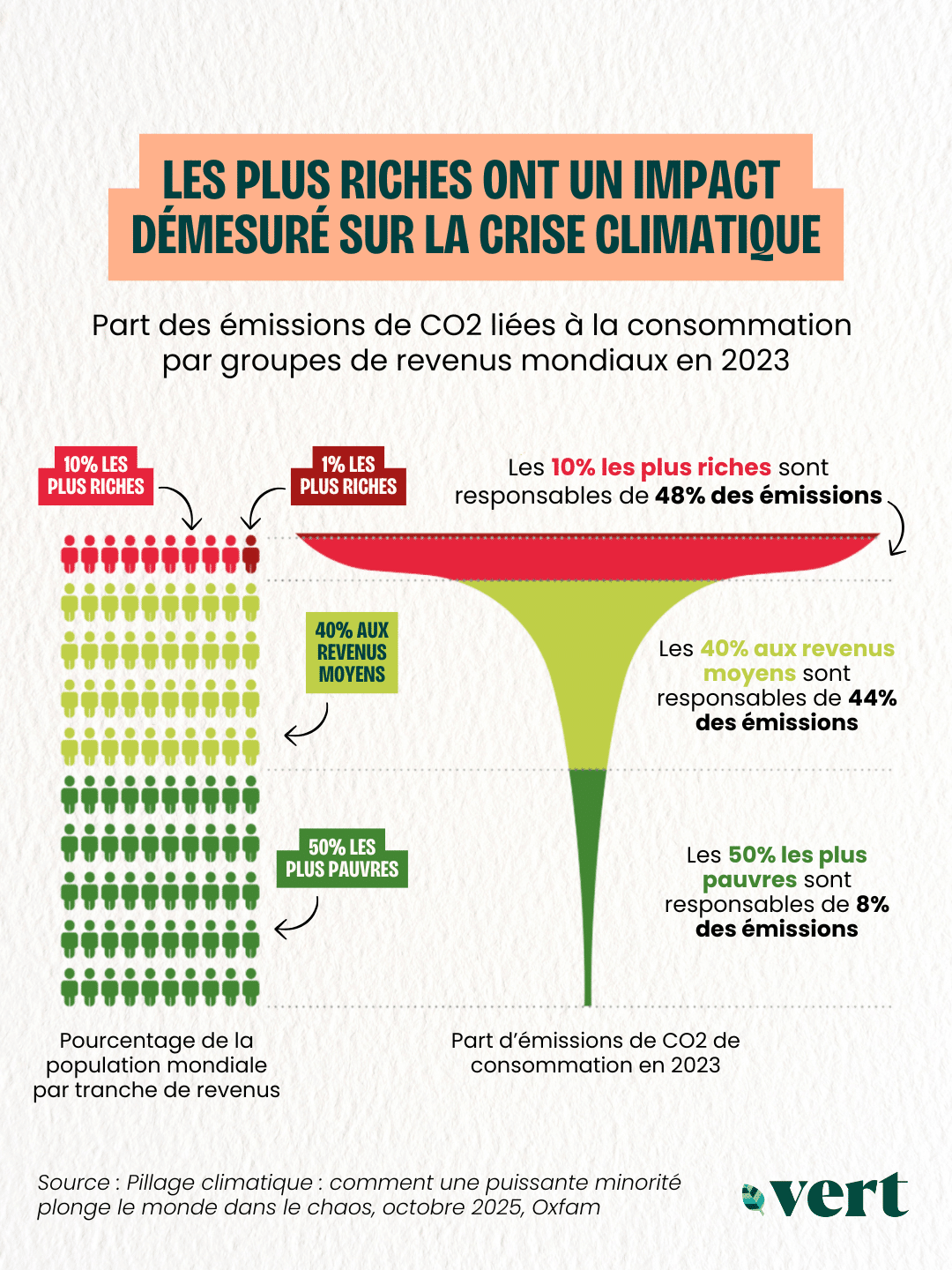 Milliardaire des der. Par leur mode de vie ostentatoire et leurs investissements polluants, les plus riches ont un impact démesuré sur le climat, alerte l’ONG Oxfam dans son dernier rapport sur les inégalités climatiques, publié ce mercredi. En 2023, une personne appartenant aux 0,1% les plus riches de la planète a émis en une seule journée plus de dioxyde de carbone (CO2) qu’un·e représentant·e des 50% les plus pauvres en un an. Depuis 1990, la part des émissions attribuable aux 0,1% les plus riches a augmenté de 32%, tandis que celle de la moitié la plus pauvre a diminué de 3%. Résultat : si tout le monde polluait autant que ces ultra-riches, le budget carbone annuel mondial (la limite d’émissions à respecter pour espérer atteindre les objectifs climatiques internationaux) serait épuisé en… moins de trois semaines.