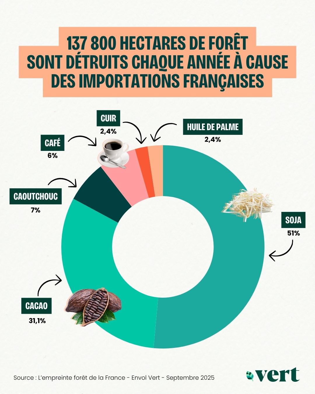 Forêt que ça change. Chaque année, en moyenne, 137 800 hectares de forêt disparaissent dans le monde en raison des importations françaises de matières premières. Cela équivaut à… «un terrain de football de forêt détruit toutes les trois minutes», détaille une nouvelle étude de l’association Envol Vert, publiée ce mardi. Parmi les produits mis en cause figurent l’huile de palme, le caoutchouc, le café, mais aussi le maïs, le gingembre… et surtout le soja, la marchandise à la plus grosse «empreinte forêt». Depuis 2014, près de 986 000 hectares de forêt ont été détruits à cause des importations françaises de soja, principalement en provenance du Brésil – des importations dédiées pour 70% à l’alimentation animale. Le cacao arrive en deuxième position, avec 514 800 hectares détruits depuis 2014, suivi du caoutchouc, responsable à lui seul de la disparition de 60 200 hectares depuis 2019. En 2018, la France a été le premier pays au monde à adopter une Stratégie nationale de lutte contre la déforestation importée (SNDI). Une stratégie «ambitieuse», selon le rapport, mais dont l’application reste encore trop «partielle»…