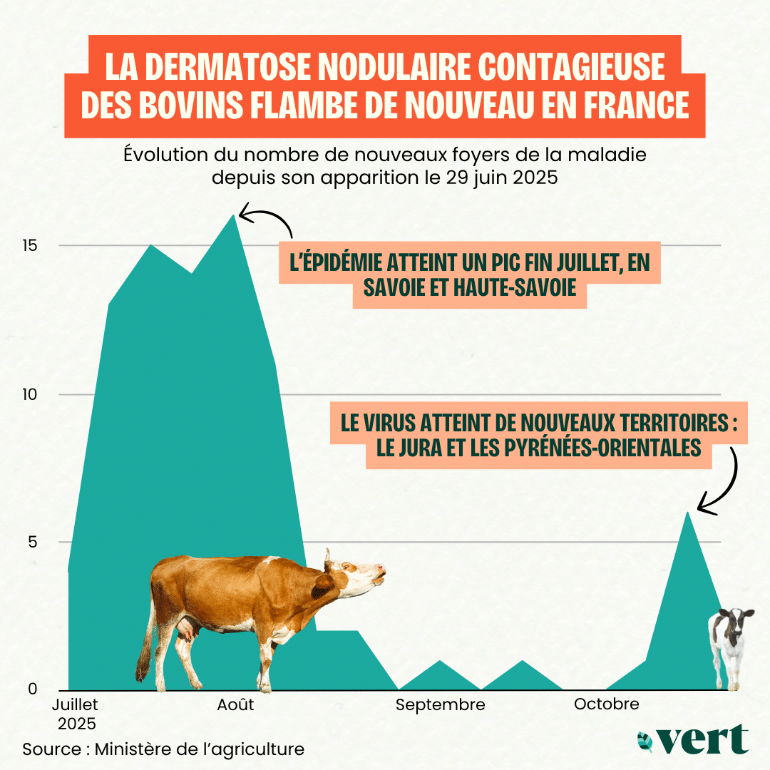 La crise de la vache affole. Le ministère de l'agriculture a décidé de suspendre l'exportation de bovins français du 18 octobre au 4 novembre afin d'endiguer l'épidémie de dermatose nodulaire contagieuse (DNC). Apparue sur le territoire français fin juin, cette maladie animale originaire d'Afrique ne concerne que les bœufs, taureaux, vaches et veaux (elle ne touche pas les humains). Transmise aux animaux par des piqûres d'insectes, elle cause forte fièvre, amaigrissement, boursoufflures sur la peau et peut conduire à la mort. Pour faire face, l'État met notamment en place l'abattage systématique de l'ensemble des bovins en contact à l'intérieur des foyers détectés – une mesure qui divise le monde agricole.