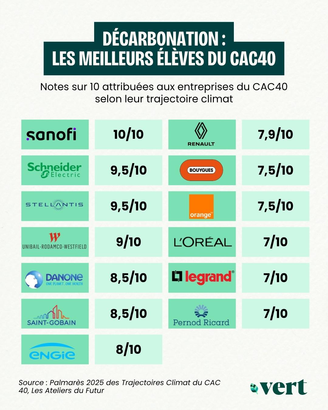 CAC ou pas cap. Lundi, l’ONG Les Ateliers du Futur a dévoilé son palmarès 2025 des trajectoires climat des entreprises du CAC40. Objectif de ce classement annuel : évaluer la crédibilité des stratégies de décarbonation des sociétés cotées en bourse, selon plusieurs critères déterminants tels que les objectifs de réduction des émissions de gaz à effet de serre à horizon 2030 et 2050, les moyens mis en œuvre pour les atteindre, ou encore la stabilité de leur gouvernance. Verdict : le géant pharmaceutique Sanofi décroche la première place avec un score parfait de 10/10, suivi de Schneider Electric et Stellantis, ex æquo avec 9,5/10. À l’autre bout du classement, TotalEnergies (2/10) et ArcelorMittal sont à la traine.