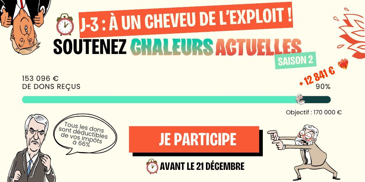 ⏰ J-3 : À TROIS JOURS de la fin de notre campagne, nous sommes à UN CHEVEU de l’exploit ! Faites un don (déductible à 66%) et permettez-nous de vous offrir une nouvelle saison de décryptages et d’enquêtes avec un journaliste à plein temps dédié à la désinformation climatique (c’est unique en France), de nouvelles vidéos de débunks et de tutos, ainsi qu’un nouveau poster pour apprendre à répondre aux climatosceptiques. Alors que le paysage de l’information s’embrase, éteignons l’incendie ensemble pendant qu’il en est encore temps ❤️🔥