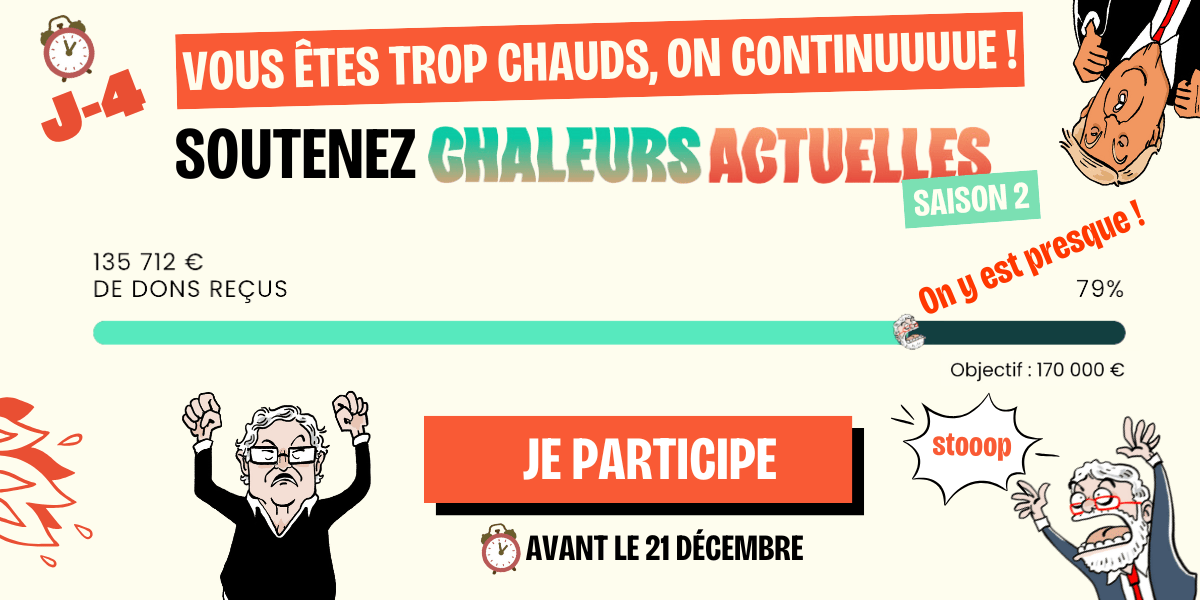 Alors que nous sommes à UN CHEVEU d’atteindre notre objectif, synonyme d’une saison 2 de Chaleurs actuelles, notre campagne se prolonge jusqu’à ce dimanche 21 décembre.