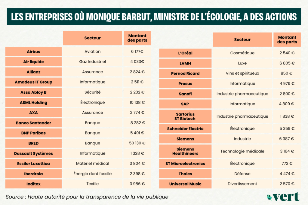 Mais parce que l’ex-patronne du WWF France cumule (d’après les chiffres arrêtés au moment de sa nomination le 12 octobre 2025) 27 «participations financières directes dans le capital d’une société». En d’autres termes : des actions dans des entreprises. Et pas n’importe lesquelles, comme Vert l’a découvert.
