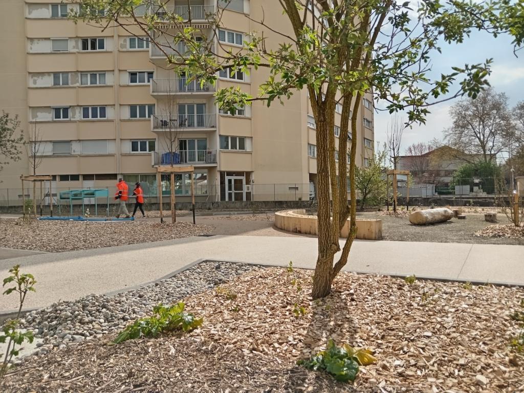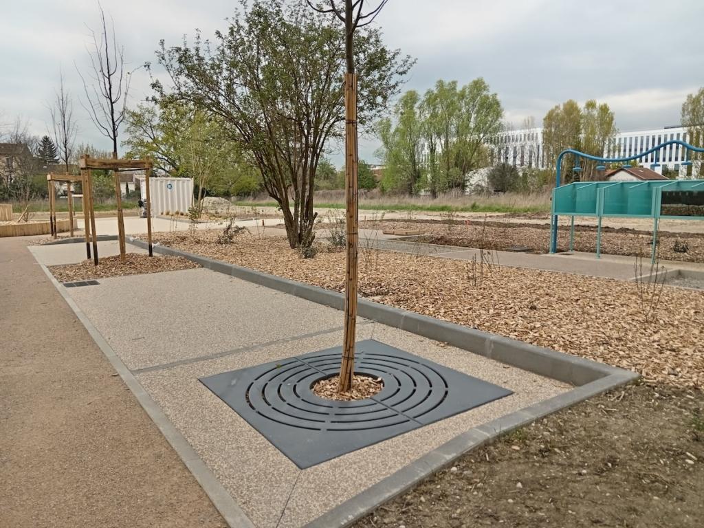 «Cette solution permet d’apporter plus d’eau à l’arbre, qui va ensuite mieux rafraîchir la ville grâce à l’évapotranspiration», souligne notre interlocuteur devant un sureau qui, contrairement aux autres végétaux du site, était déjà là avant le début des travaux. L’évapotranspiration correspond à l’émission de vapeur d’eau dans l’atmosphère depuis le sol et la surface des végétaux. Les arbres de pluie sont donc de précieux alliés face à la hausse des températures en ville. La métropole de Lyon s’était donné l’objectif d’en réaliser 800 sur le mandat écoulé (2020-2026). Une première étape dans sa volonté de passer d’une ville imperméable à une ville perméable végétalisée.
