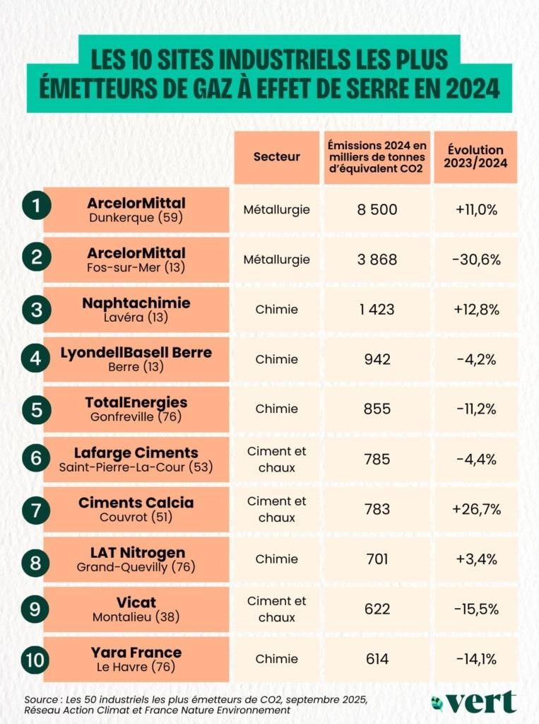 En haut du classement figure le site d’Arcelor Mittal à Dunkerque (Nord). Cette usine de production métallurgique a émis 8,5 millions de tonnes d’équivalent CO2 en 2024 – en augmentation de 11% par rapport à l’année précédente. Elle est suivie par le site de Fos-sur-Mer, qui appartient aussi à ArcelorMittal et qui a rejeté 3,8 millions de tonnes d’équivalent CO2 sur l’année (-30,6%). À la troisième place du podium arrive l’usine de Naphtachimie, située dans le quartier de Lavéra à Martigues (Bouches-du-Rhône). Ce site a émis 1,4 millions de tonnes d’équivalent CO2 l’an dernier (+12,8%).