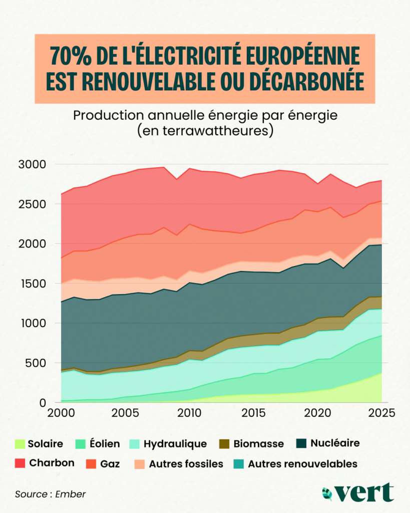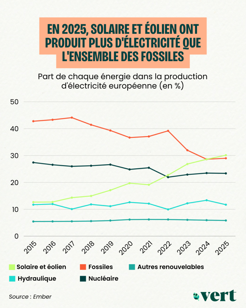 En 2025, le solaire et l’éolien ont généré 30% de l’électricité européenne, contre 29% pour l’ensemble des énergies fossiles réunies (pétrole, gaz et charbon). En 2000, ces dernières représentaient plus de 50% du mix électrique européen, tandis que le solaire et l’éolien constituaient moins de 1% en cumulé.