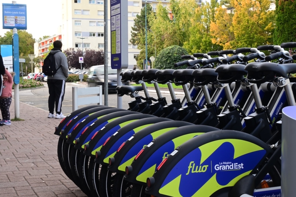 Alignés à côté de l’arrêt de bus de la gare de Saint-Louis (Haut-Rhin), impossible de manquer les vélos électriques aux garde-boue bleus et verts, estampillés du logo de la région Grand Est et de celui de son réseau mobilité, Fluo.