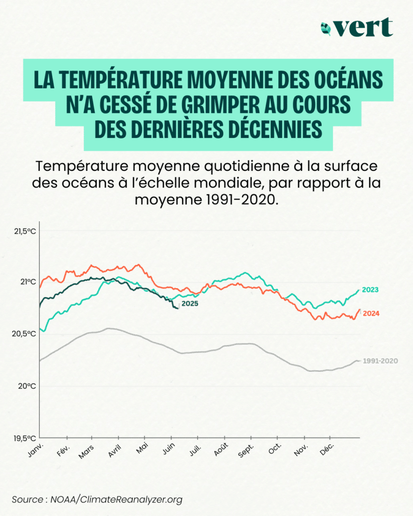 🌡️ Les canicules marines ont battu de nouveaux records en 2023 et 2024, dépassant de 0,25°C les années 2015 et 2016. Ces «incendies sous-marins» ont des conséquences dévastatrices sur la biodiversité et les économies côtières (notre reportage).