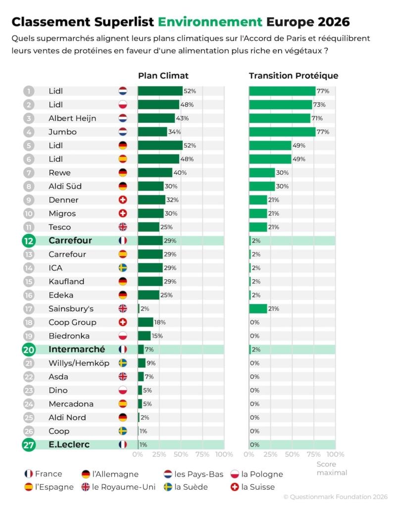 Les principaux supermarchés français «sont à la traîne» sur la lutte contre le changement climatique et la transition vers une alimentation plus durable et végétale, comparés à leurs homologues européens, Néerlandais en tête. C’est ce que révèle un rapport publié ce mardi par le centre de réflexion néerlandais Questionmark, élaboré avec le Réseau action climat (RAC) pour le volet français.