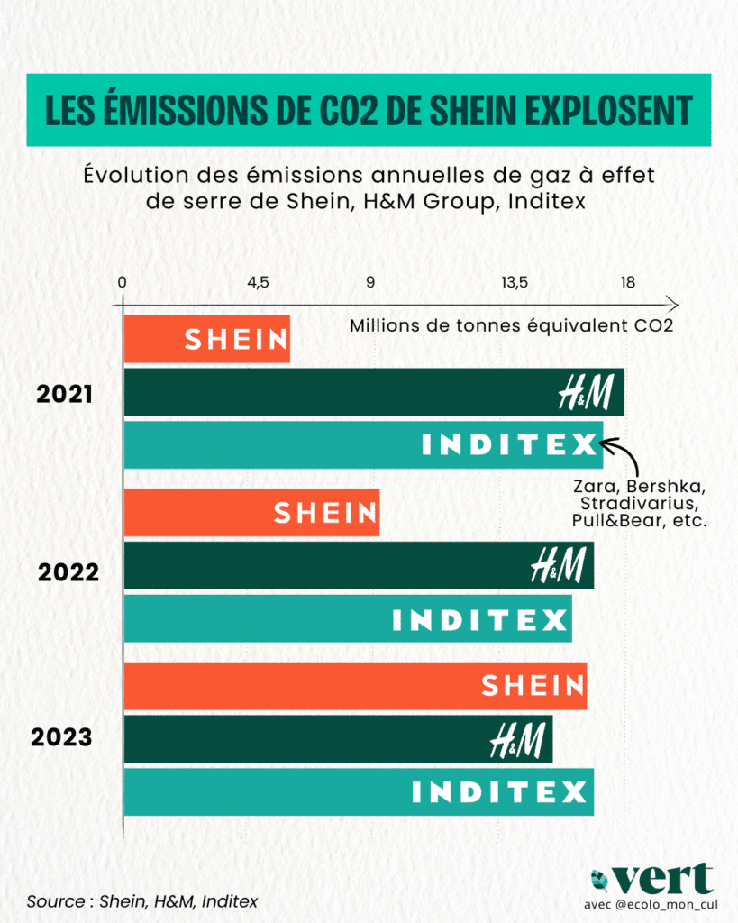 Shein, qui emploie 16 000 personnes dans le monde et a réalisé 23 milliards de dollars (20 milliards d’euros) de chiffre d’affaires en 2022, est la marque de vêtements qui pollue le plus aujourd’hui (du point de vue des émissions carbone). Entre 2021 et 2023, la firme a multiplié par deux ses émissions de gaz à effet de serre (GES), détrônant les pionniers du secteur comme H&M ou Zara. Et la plupart des vêtements qu’elle fabrique sont en polyester, reléguant tout au long de leur cycle de vie des microparticules de plastique dans l’environnement – qui s’immiscent dans la chaine alimentaire avant de finir dans nos assiettes (notre article).
