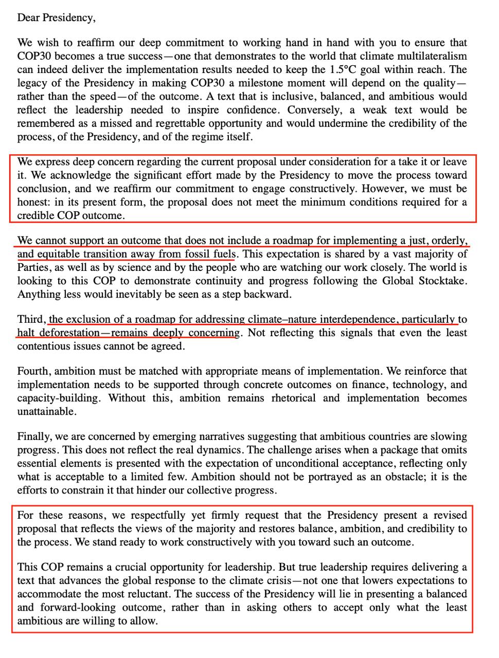 En cause, la disparition de toute mention sur la sortie des énergies fossiles, pourtant réclamée par 82 pays. «Nous reconnaissons l’important effort de la présidence pour faire avancer les négociations […] Néanmoins nous devons être honnêtes : dans sa forme actuelle, la proposition ne remplit pas les conditions minimales nécessaires pour garantir des résultats crédibles à la COP», écrivent les pays signataires de la lettre dévoilée par le média Carbon brief. Cela ouvre la voie à un nouveau round de négociations.