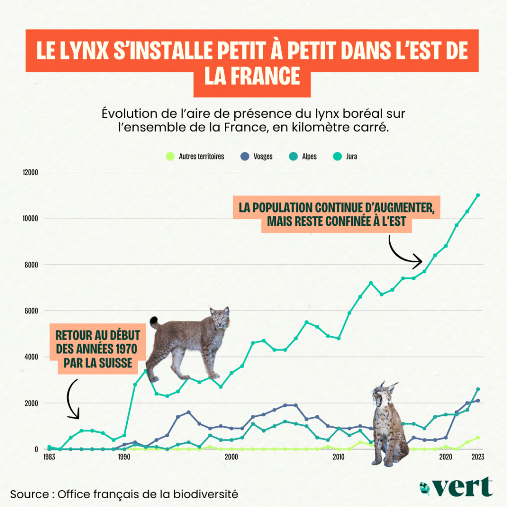 Au fil du temps, trois noyaux de population se sont consolidés à l’est de la France : dans le massif jurassien – qui concentre l’essentiel des quelque 200 individus aujourd’hui estimés dans le pays –, celui des Vosges (qui a connu une tentative de réintroduction peu fructueuse dans les années 1980) et plus récemment dans le nord des Alpes. «Son aire de présence augmente, mais pas comme elle aurait dû, car il y a énormément de mortalité, regrette Gilles Moyne. En 50 ans, le lynx a à peine franchi l’autoroute A6 et la Saône.» Lynx lynx est classé «en danger» sur la liste rouge française des espèces menacées.