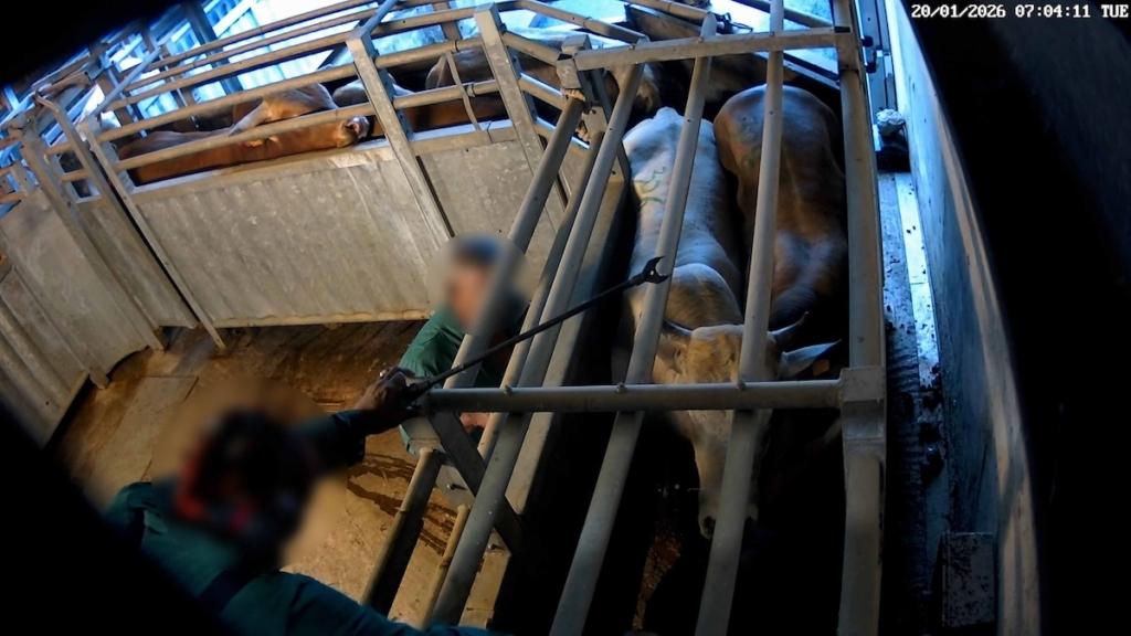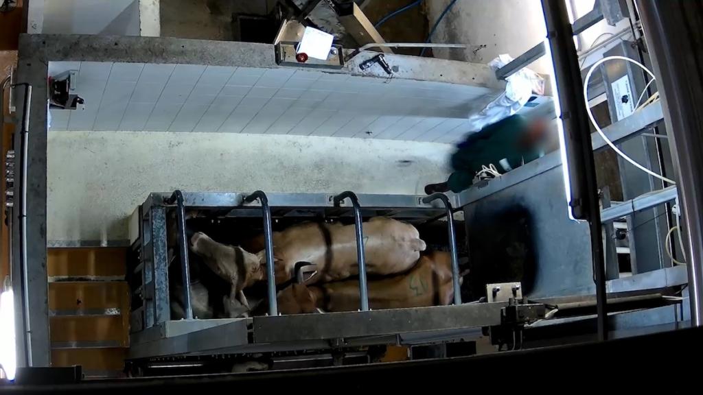 Des problèmes de procédures ont également été observés. Sur les images, aucun test de conscience n’est effectué pour s’assurer que les bovins sont correctement étourdis. Des vaches se retrouvent donc à être égorgées vivantes. Certaines bougent encore au moment de la découpe. Avant l’étourdissement, elles subissent aussi des coups abusifs d’aiguillon électrique sur des zones pourtant interdites. Les décharges doivent rester exceptionnelles, limitées aux muscles des membres postérieurs des vaches adultes, et uniquement lorsqu’elles refusent d’avancer. Or les vidéos révèlent un recours répété à cette pratique, y compris sur les veaux.