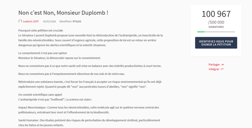 Ce citoyen engagé dénonce la nouvelle tentative du sénateur Les Républicains Laurent Duplomb de réautoriser des néonicotinoïdes, des pesticides nocifs pour la biodiversité et la santé. Depuis l’été dernier et la loi Duplomb 1, l’élu de Haute-Loire a affiné son texte et demande la réintroduction de ces produits uniquement pour les champs de betteraves, noisettes, pommes et cerises. En août dernier, sa mesure avait été censurée par le Conseil constitutionnel parce qu’elle contrevenait à la charte de l’environnement. À l’époque, une première pétition contre son texte décrié avait rassemblé plus de deux millions de signatures.