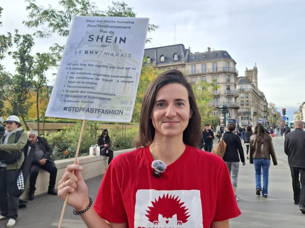 Avec leur haut rouge floqué d’un hérisson blanc et leur pancarte à la main, les membres de France nature environnement sont reconnaissables de loin. Pour Axèle Gibert, responsable des problématiques liées à la réduction des déchets au sein de l’organisation, il était important de venir pour sensibiliser les client·es à l’impact environnemental de Shein. Elle explique : «On assiste à une banalisation de l’ultra-fast fashion, un modèle extrêmement néfaste pour la planète, en lui accordant une place de choix au sein d’une enseigne symbole de l’excellence française.»