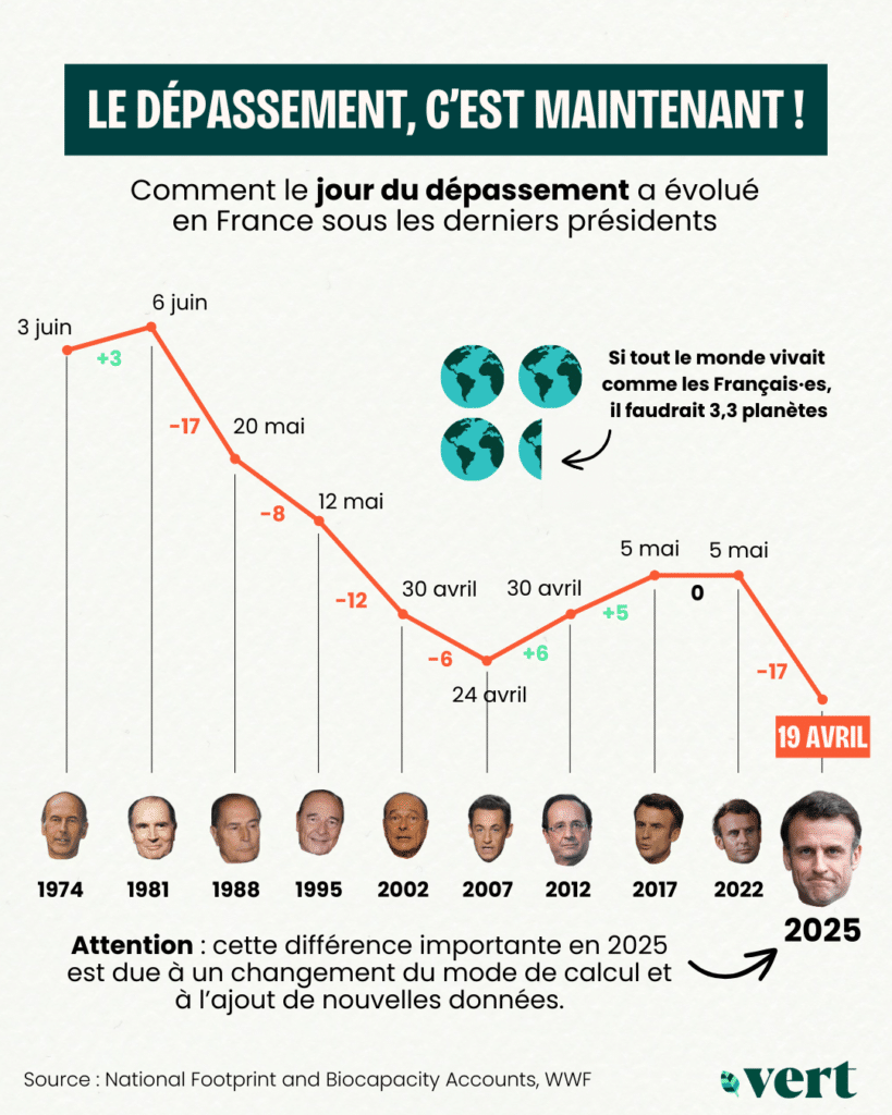 Pour montrer que la responsabilité dans cette consommation excessive diffère selon les endroits du globe, cette date limite est déclinée pour chaque pays. En France, en 2025, le «jour du dépassement» tombe ce samedi 19 avril : si l’ensemble de l’humanité adoptait le mode de vie d’un·e Français·e moyen·ne, nous aurions déjà épuisé un an de ressources de la Terre.