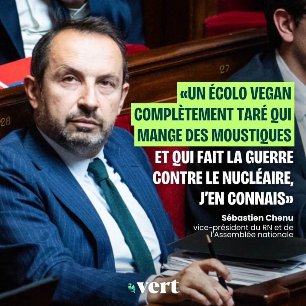 Le Chenu manquant. Interrogé le 8 octobre par BFM TV sur les points qui pourraient unir la droite et le Rassemblement national, le vice-président du RN et de l’Assemblée nationale Sébastien Chenu a estimé que cette union était moins compliquée que celle entre «un vieux communiste pro-nucléaire et un écolo complètement végan, taré, qui mange des moustiques et qui fait la guerre au nucléaire». Ce n’est pas la première fois que le député du Nord caricature les écologistes : en mai dernier, interrogé par France 2 sur la polémique autour du comté, que les écolos voulaient soi-disant interdire, il s’était lâché : «Les écolos sont des dingues, ils veulent punir, interdire […] emmerder les Français du matin au soir.»