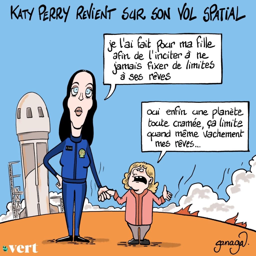 La croisière ça fuse. Le 14 avril, au Texas (États-Unis), la chanteuse américaine Katy Perry et cinq autres célébrités se sont envolées dans une fusée Blue Origin – l’entreprise du patron d’Amazon Jeff Bezos – pour une excursion de onze minutes dans l’espace. Un trajet responsable de l’émission d’environ 15,5 tonnes de CO2 par personne. Soit l’équivalent de ce qu’émet un·e Français·e en… un an et demi. À son retour sur Terre, elle n’a pas hésité à embrasser le sol avant de s’exclamer qu’elle venait de vivre «la meilleure expérience après celle d’être mère». Elle s’est d’ailleurs dit «plus que jamais motivée pour être un exemple pour [sa] fille Daisy, et lui montrer que les femmes doivent occuper l’espace». Les critiques n’ont pas tardé à fuser : «déconnexion», «irrespect», «enfantillages»… De quoi rendre fière Daisy.