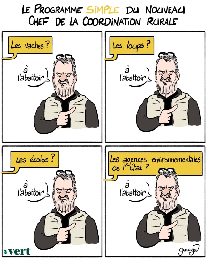 Depuis six ans qu’il dirige la chambre d’agriculture locale, Bertrand Venteau s’est fait remarquer pour sa vive critique des «écologistes», qu’il a même qualifié·es de «terroristes». «J’assume complètement de combattre l’écologie décroissante», confirme-t-il auprès de Vert. Souhaitant faire de la «lutte contre l’écologie punitive et décroissante» son «cheval de bataille» au niveau national, il annonce la mise en place d’un budget afin de soutenir les agriculteur·ices dans des actions en justice face à des associations environnementales : «Comme l’écologie punitive nous combat, nous allons la combattre».