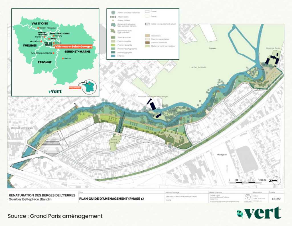 D’ici à 2034, une fois les familles expropriées, le Syndicat mixte pour l’assainissement et la gestion des eaux du bassin versant de l’Yerres (SyAGE), en charge des travaux de renaturation, prévoit de terrasser les parcelles pour récréer 11 hectares de zones humides le long d’une Yerres reprofilée selon son lit naturel, et élargie. Sur des passerelles, les promeneur·ses observeront de loin les martins-pêcheurs et les écureuils batifoler dans des ripisylves (les formations boisées présentes sur les rives d’un cours d’eau) remodelées de la main de l’homme.