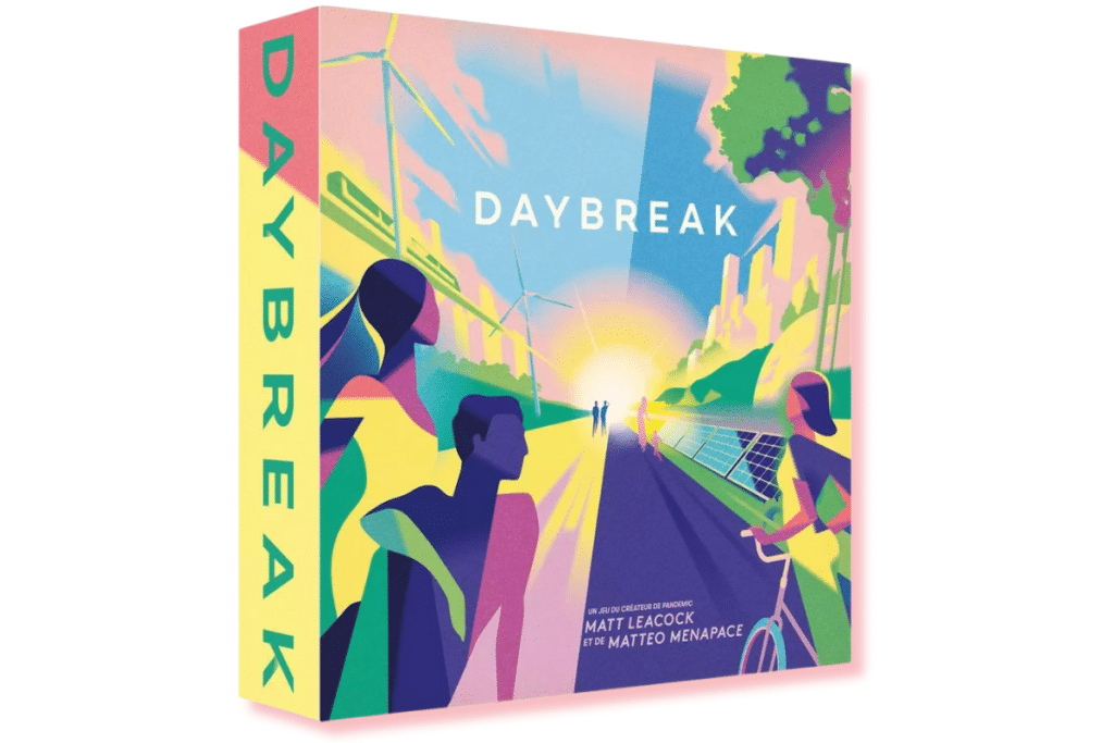Dans Daybreak, chaque joueur·se incarne une puissance mondiale différente et doit œuvrer à l’objectif commun : «Réduire les émissions de carbone avant qu’il ne fasse trop chaud ou que trop de communautés n’entrent en crise.» Pour y parvenir, développez les énergies renouvelables, régulez les paradis fiscaux, lancez des projets locaux ou plantez des arbres. Un jeu de stratégie résolument optimiste qui nous montre que des solutions existent pour lutter contre la crise climatique. Et en bonus, les cartes sont ornées de très belles illustrations.