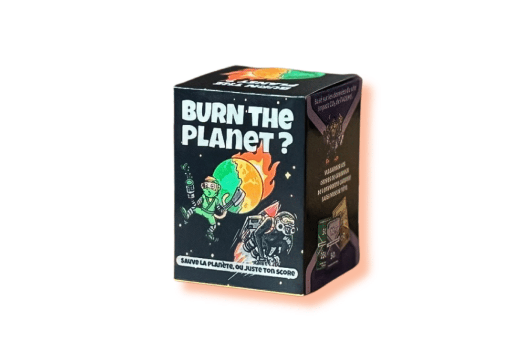Dans Burn the Planet ?, vous explorez différents modes de vie au fil des manches. Train ou avion ? Régime carné ou végétarien ? Chaque décision influence directement votre empreinte carbone. À vous de faire les bons choix pour limiter votre impact ! Des cartes «action» viennent pimenter la partie en permettant de piéger vos adversaires ou de renverser la situation. Basé sur les données de l’Agence de la transition écologique (Ademe), ce jeu pédagogique et ludique aide à comprendre, tout en s’amusant, les ordres de grandeur de l’impact carbone de nos actions.