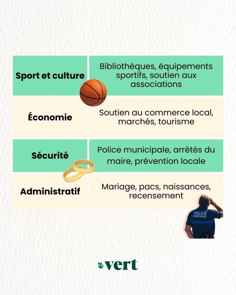 👮♂️ Sécurité : En tant qu’officier·es de police judiciaire, les maires ont un devoir d’assurer la sûreté, la sécurité, la salubrité et l’ordre public sur le territoire de la commune. Pour cela, elles et ils peuvent prendre des arrêtés municipaux pour interdire la circulation dans une rue ou limiter les horaires des bars, et faire intervenir la police municipale pour s’assurer du respect de ces règles.