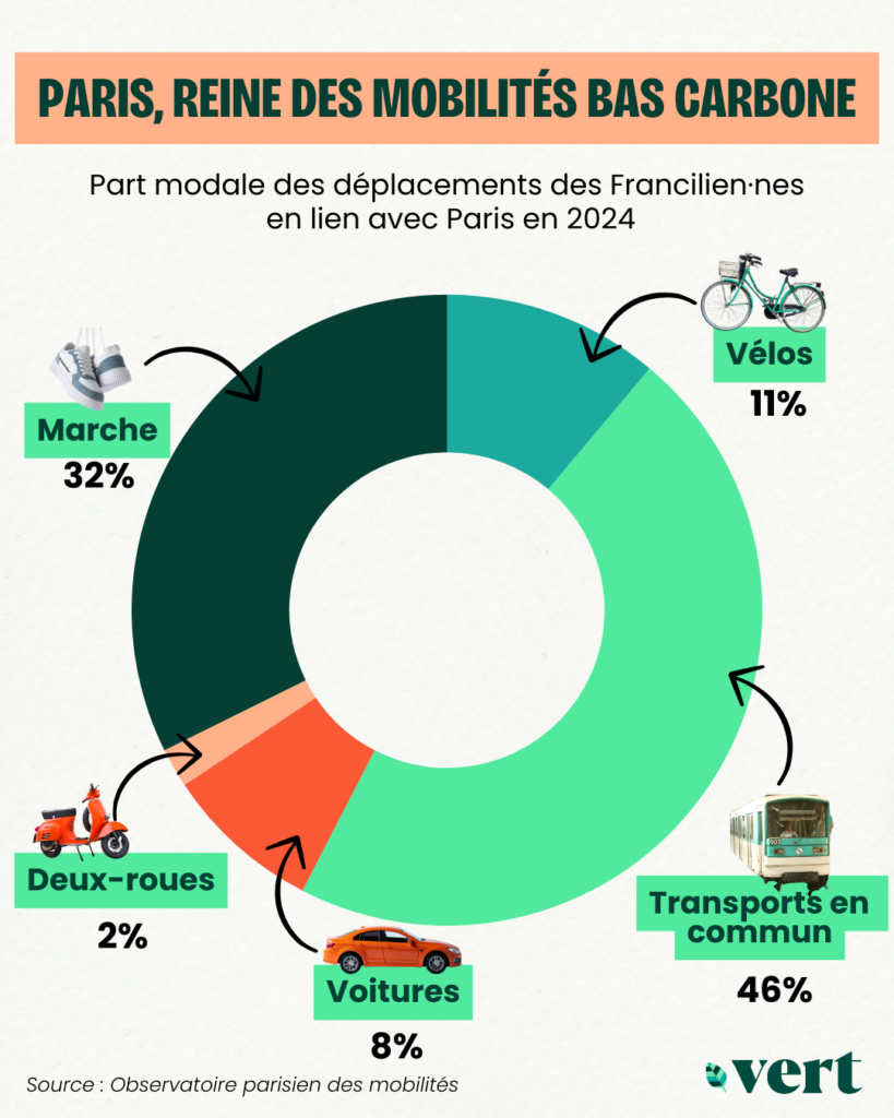 💡 La pratique du vélo s’est envolée à Paris, où le biclou représentait 11% des déplacements en 2024, contre 3% en 2010.