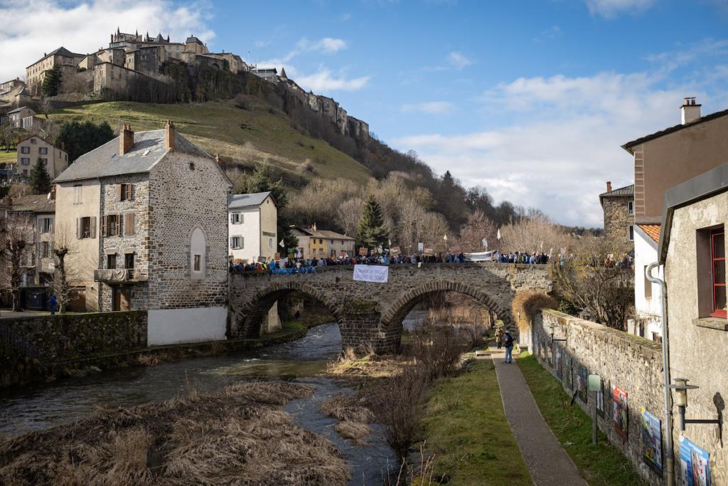 Foulards, K-Way, bonnets… en respect du code vestimentaire exigé, 50 nuances de bleu se sont déployées à partir de 14 heures sur la place de la Liberté, sous un ciel vacillant entre nuages menaçants et belles éclaircies. «Ne faites pas du Cantal un gruyère», «Du salers pas du sale air», «Pas de diatomite dans la truffade»… Armés de pancartes aux slogans fleurant bon les vaches et le fromage, quelques centaines de Cantalou·es ont joyeusement défilé dans le bas de Saint-Flour, au pied de la colline sur laquelle est perché le centre historique de la ville de 6 000 habitant·es.