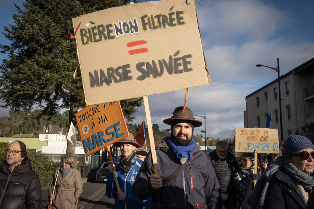 Une décision que les opposant·es contestent, arguant qu’il existe dans de nombreux cas des alternatives à la diatomite, qu’une grande partie est déjà exportée et que son utilisation pour le plasma sanguin, très mise en avant par l’entreprise, ne représente qu’une part minime des usages. «La diatomite c’est pas automatique» et «Bière non filtrée = Narse sauvée», résument des panneaux dans la foule.