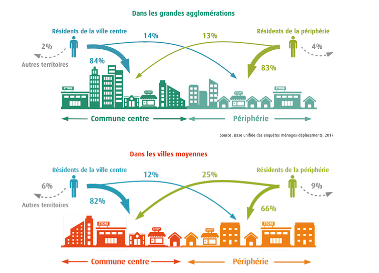 L’idée selon laquelle les clients se rendraient massivement en centre-ville pour y consommer, depuis la périphérie, est mise à mal par les études existantes : dans les grandes villes, 84 % des habitants de la ville-centre achètent majoritairement dans cette même ville-centre, alors que très peu de résidents de la périphérie viennent pour leurs emplettes.