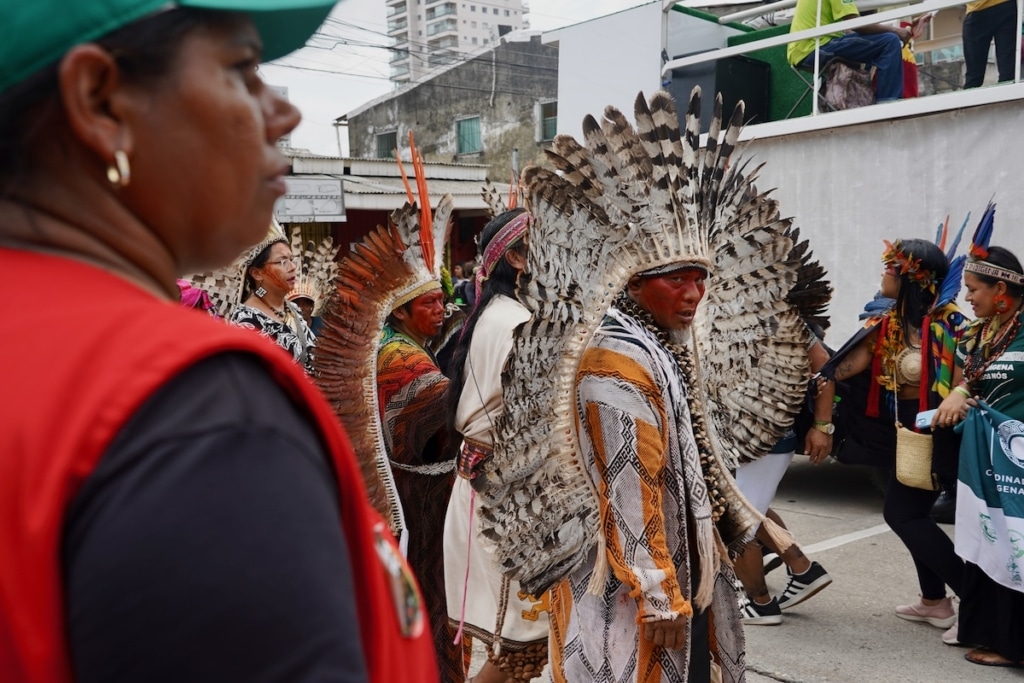 Les militant·es sont accueilli·es par des floppées de policier·es militaires, placé·es stratégiquement pour les empêcher de s’approcher du centre névralgique des négociations officielles, à deux kilomètres de là. La semaine précédente, des peuples autochtones y avaient pénétré à plusieurs reprises pour revendiquer leurs droits.