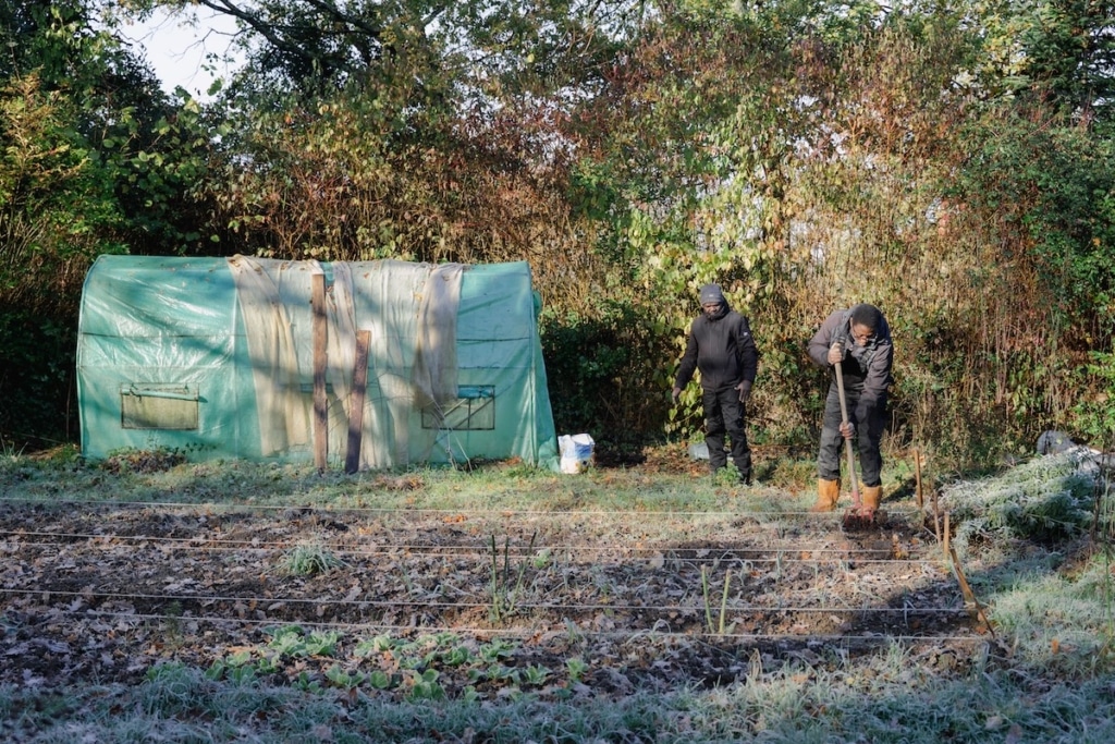 En février 2025, une première parcelle d’un hectare leur est ouverte à Melesse, à 15 kilomètres au nord de Rennes, grâce au relais du projet par le collectif Campagnes ouvertes et solidaires. Le groupe s’achète alors du matériel, sacrifiant en partie leur maigre allocation de demandeur·se d’asile. La solidarité rurale fait le reste. Brouettes, pelles, fourches, bottes leur sont données par des agriculteur·ices du coin. L’équipement reste rudimentaire, mais la motivation est là.