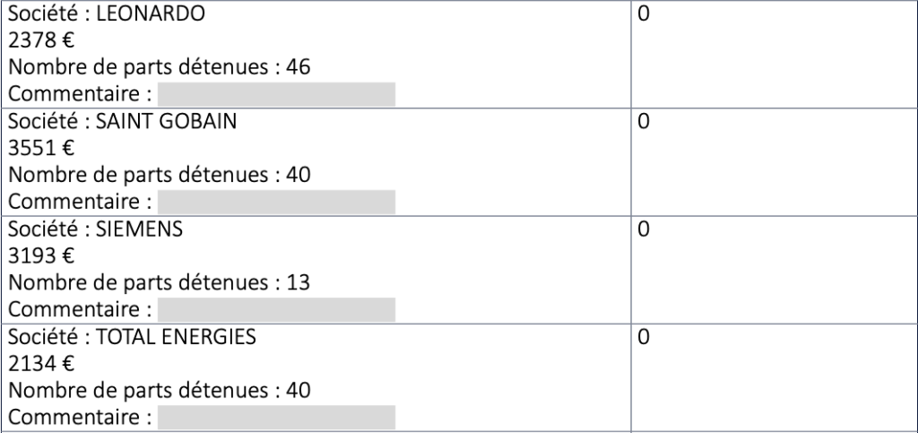 Sur cette première version, on trouve une ligne… TotalEnergies, le géant français des hydrocarbures, dont la ministre a détenu 40 actions pour un montant de 2 134 euros. Autre surprise, on découvre le nom de Saint-Gobain, le groupe français de matériaux de construction (3 551 euros), qui figure aussi parmi les plus importants émetteurs de gaz à effet de serre en France. On trouve enfin une ligne de 2 378 euros dans l’entreprise italienne Leonardo, spécialisée dans les systèmes de défense aérospatiale.