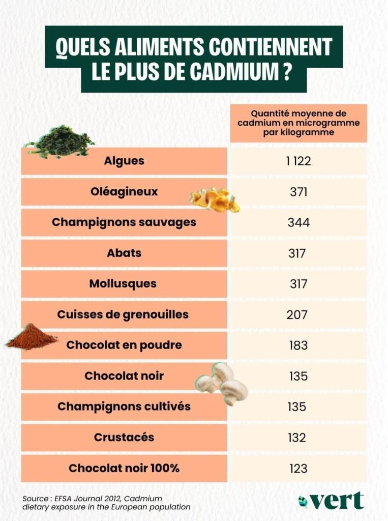 Les aliments qui y contribuent sont à la fois ceux dont la teneur en cadmium est importante, mais aussi les plus consommés par les Français·es. Les «produits céréaliers : céréales du petit-déjeuner, pains et produits de panification sèche, viennoiseries, pâtisseries, gâteaux et biscuits sucrés, pâtes, riz et blé ainsi que les pommes de terre et certains légumes», détaille l’Anses. Mais aussi le tabac, «qui constitue une source supplémentaire d’imprégnation au cadmium». À l’inverse, note l’institution, «le chocolat est un contributeur mineur à l’exposition au cadmium, par rapport aux produits céréaliers et aux pommes de terre».