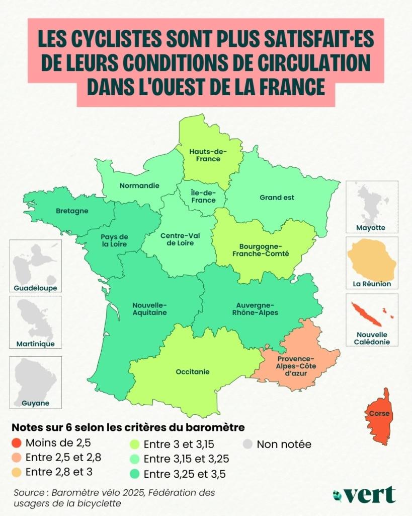 L’évolution du climat vélo n’est pas homogène sur le territoire (voir la carte interactive). Les moyennes régionales des notes révèlent que le quart sud-est de la France hexagonale décroche (notamment la région Provence-Alpes-Côte d’Azur et la Corse) malgré une évolution positive (respectivement 7% et 11%). À l’inverse, la façade atlantique «confirme son dynamisme en matière de vélo», note le rapport. Les communes des régions Pays de la Loire, Bretagne et Nouvelle-Aquitaine affichent en moyenne les meilleures notes. Elles sont talonnées par celles des régions Auvergne-Rhône-Alpes et Grand Est.