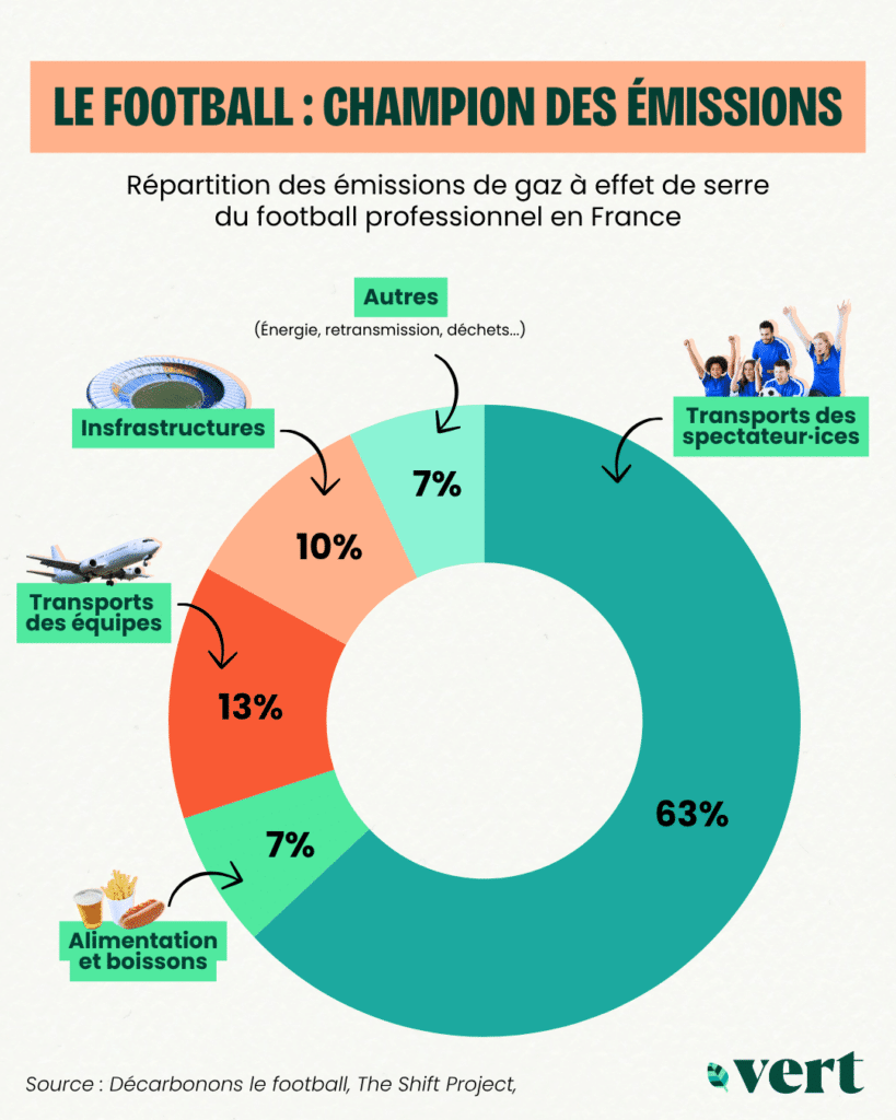 Premier levier possible pour réduire ces émissions : proposer aux spectateur·ices une alimentation non carnée et locale. Les organisateur·ices des Jeux olympiques de Paris 2024 se targuaient de servir des produits à 80% d’origine française. La nourriture dans les stades «passe souvent par des prestataires externes et il est pour le moment difficile de récupérer des données fiables sur le sujet» concernant le football français, explique Alexis Lepage, membre du groupe Sport et Climat du Shift Project.