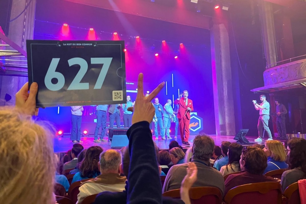 À Paris, la soirée nationale de La Nuit du bien commun était d’abord prévue comme chaque année à l’Olympia (propriété de Vivendi, le groupe d’un autre milliardaire d’extrême droite, Vincent Bolloré), qui compte 2 000 places. Mais elle a été reprogrammée aux Folies Bergère (une salle également contrôlée par Vincent Bolloré), où il y a 1 700 places. Remplir la salle était l’une des inquiétudes des organisateur·ices. «À l’approche du grand soir, nous sommes tournés vers une priorité : faire salle comble !» écrivent-elles et ils dans un e-mail que les participant·es ont reçu après avoir validé leur place.