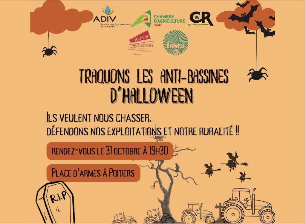 Deux araignées et quelques chauves-souris ne suffiront pas à masquer l’agressivité du message publié sur la page Facebook de la Coordination Rurale (CR) de la Vienne. Mardi, en fin de matinée, la branche locale de ce syndicat agricole, connu pour ses positions parfois proches de l’extrême droite, a lancé un appel à «traquer» les militant·es anti-bassines le soir d’Halloween. Ces dernier·es s’opposent à la construction de retenues de substitution censées protéger les paysan·nes des sécheresses mais accusées d’accaparer la ressource en eau (notre décryptage).