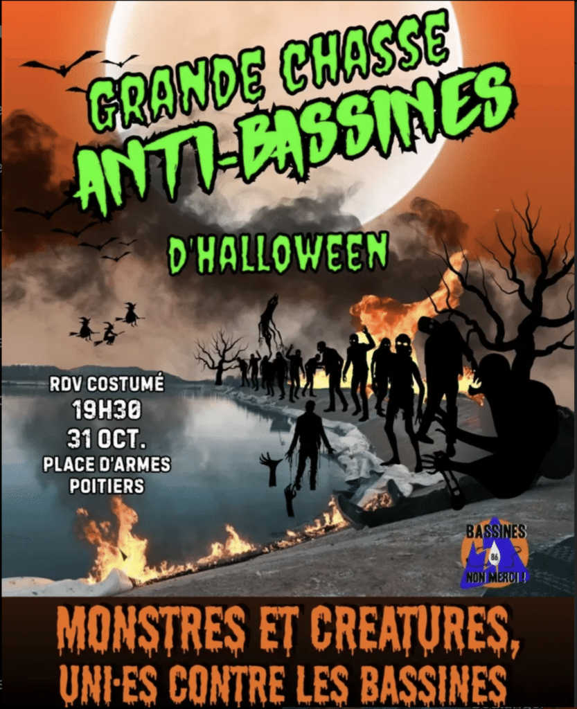 La semaine dernière, le collectif Bassines Non Merci 86 avait invité ses sympathisant·es à «fêter», le 31 octobre au soir, «la mort» des 41 projets de megabassines du bassin du Clain – une rivière qui traverse plusieurs départements, dont la Vienne. Sur Instagram, il annonçait aussi «une grande chasse aux bassines d’Halloween».