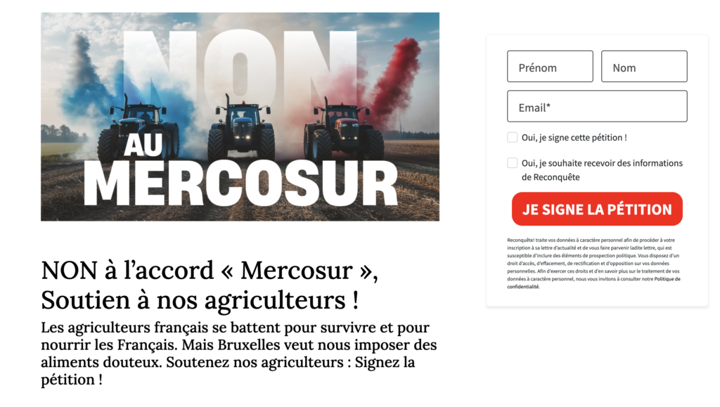 Un des liens les plus partagés sur X est une pétition, hébergée sur le site soutien-agriculteurs.fr, contre l’accord de libre-échange du Mercosur. Une fois signée avec son e-mail, cette pétition renvoie… sur le site ericzemmour.fr où il est proposé de faire un don au polémiste d’extrême droite, condamné pour «provocation à la haine».